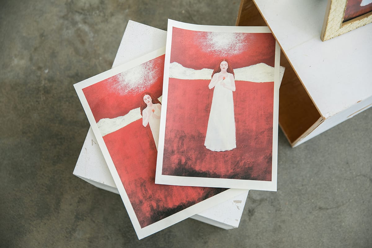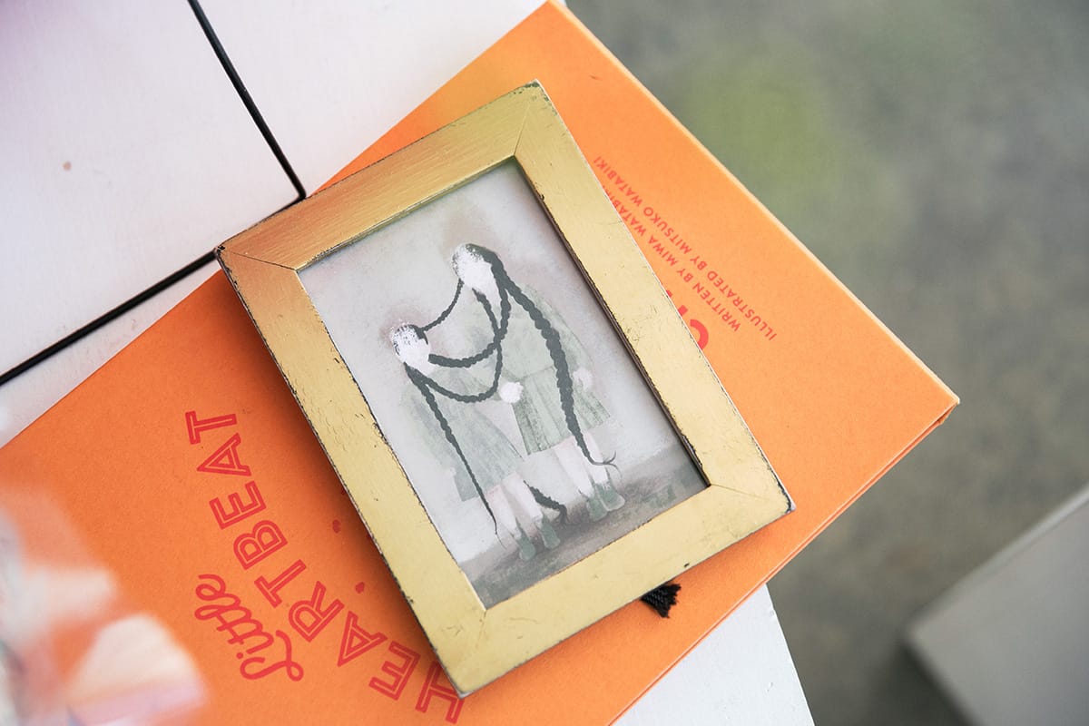目を開けたものも描きましたが、それだと『女性』を強く感じたので目を閉じて描き直しました。目を開けたものも、展示ではさりげなく置いておきました。(このページ写真にもあります。)